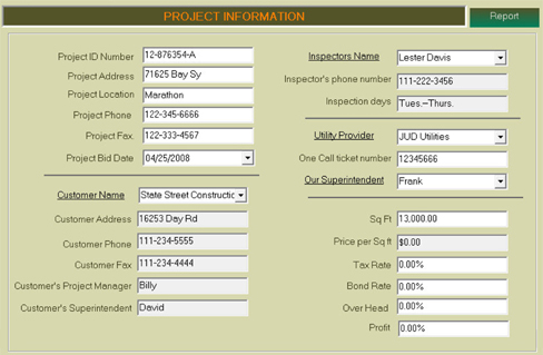 Names, addresses, phone numbers, inspectors, utility providers, inspection days, call-to-dig tickets, permit numbers, project notes, and more.