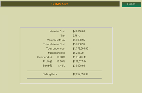 Material cost, tax, labor, miscellaneous, overhead, profit, and bond.